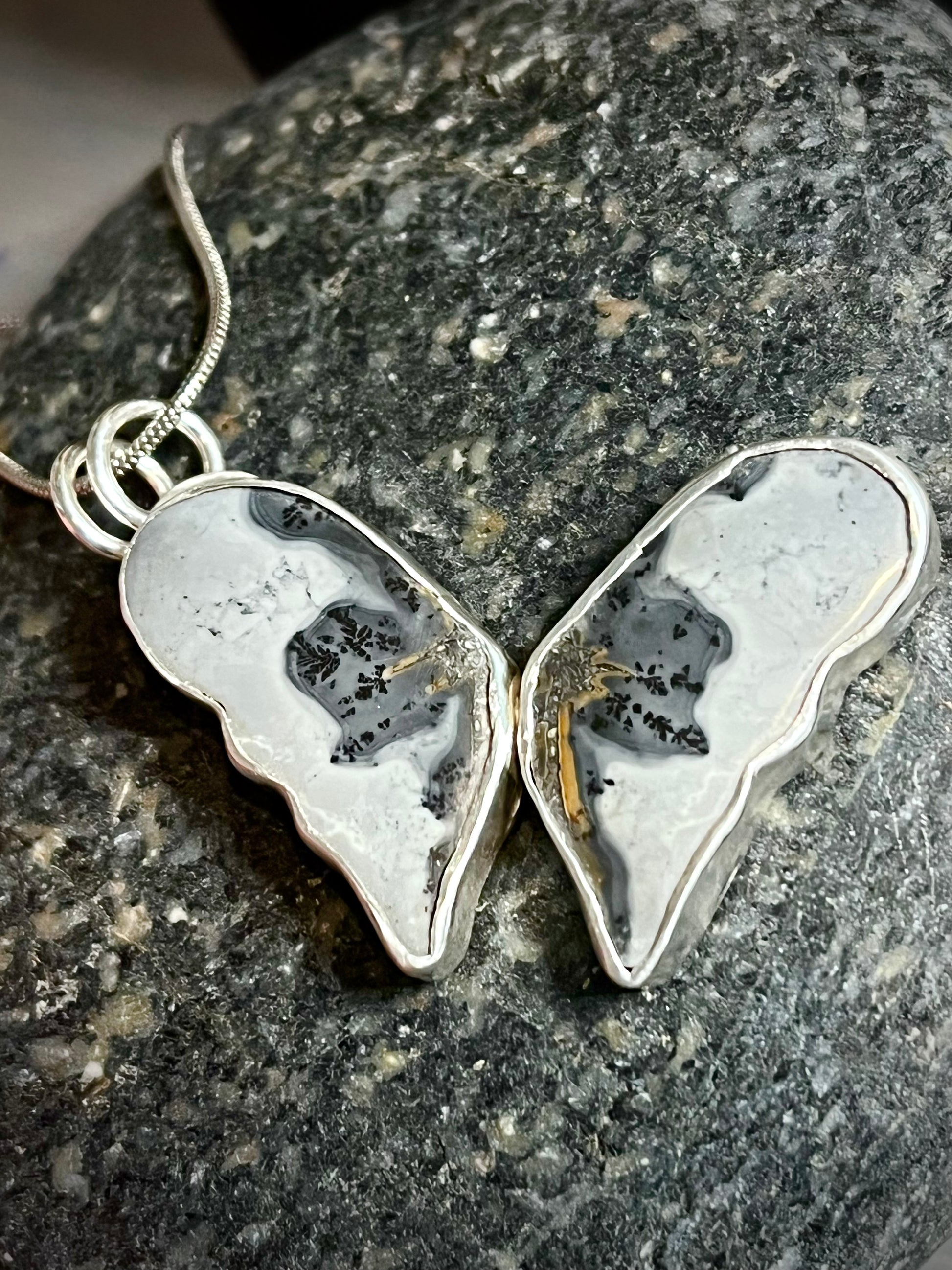 Maligano jasper is known for its wild, painterly inclusions — branching patterns that look like frost on glass or ferns pressed into stone. This butterfly pendant lets the stone do the storytelling, set in a hand-fabricated sterling silver frame shaped to mirror the wings.