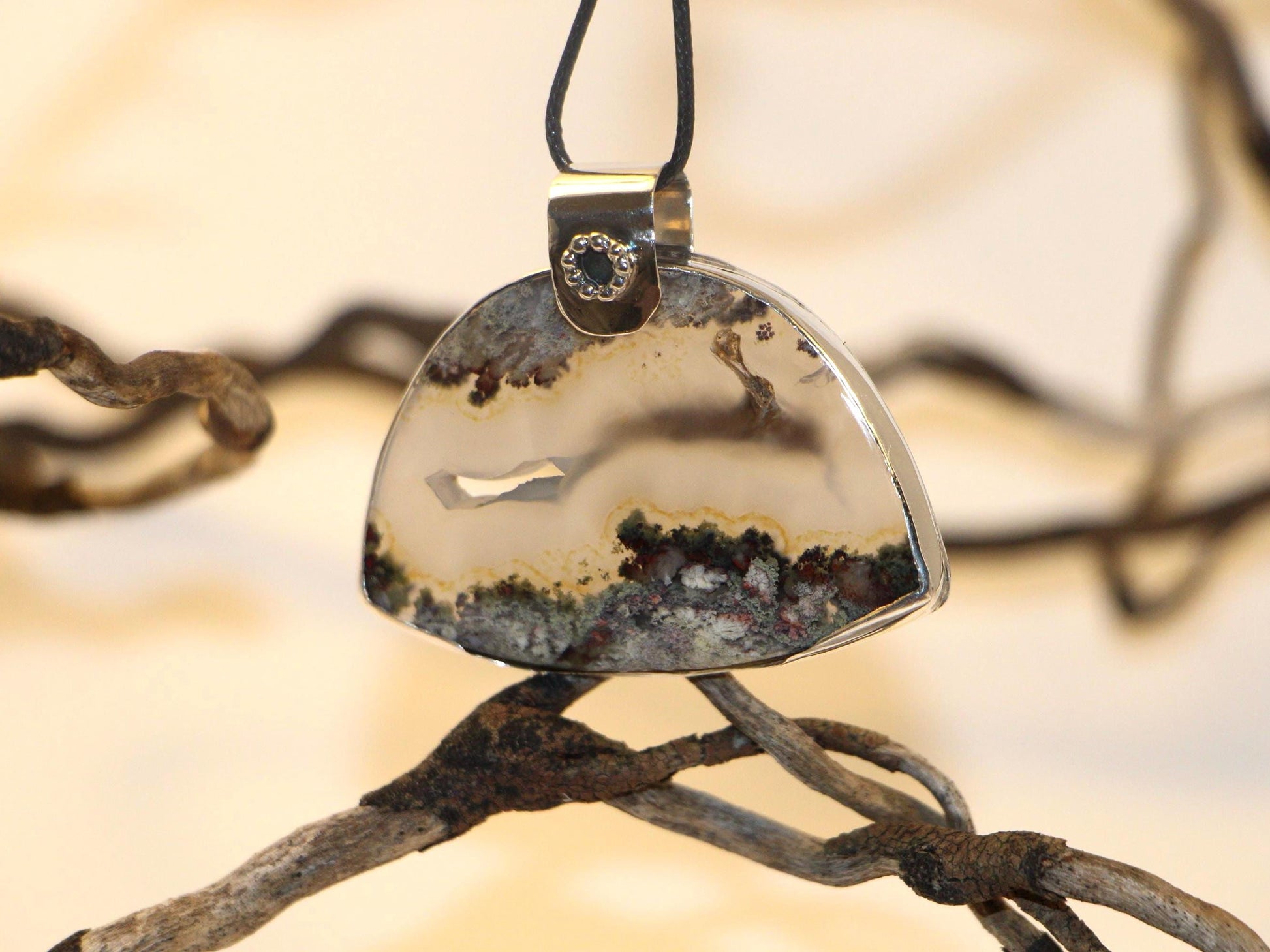Moss Agate Sterling Silver Pendant, Half Moon Scenic Necklace