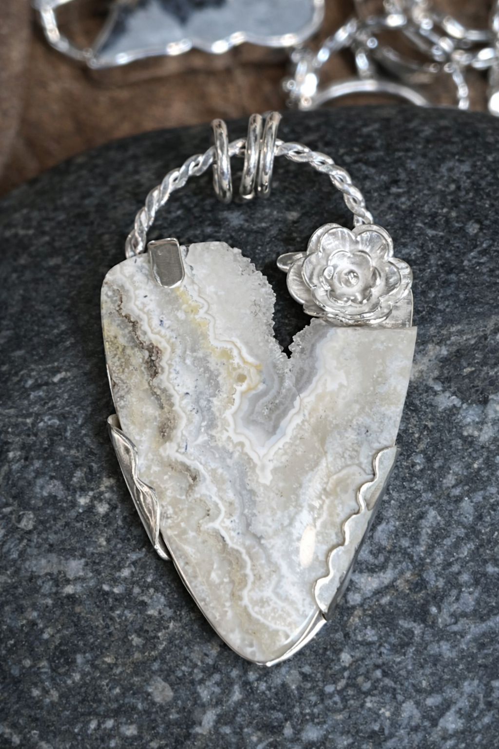 Heart Druzy Agate Pendant Sterling Silver | Reversible Botanical Statement Necklace | One of a Kind Handmade Jewelry