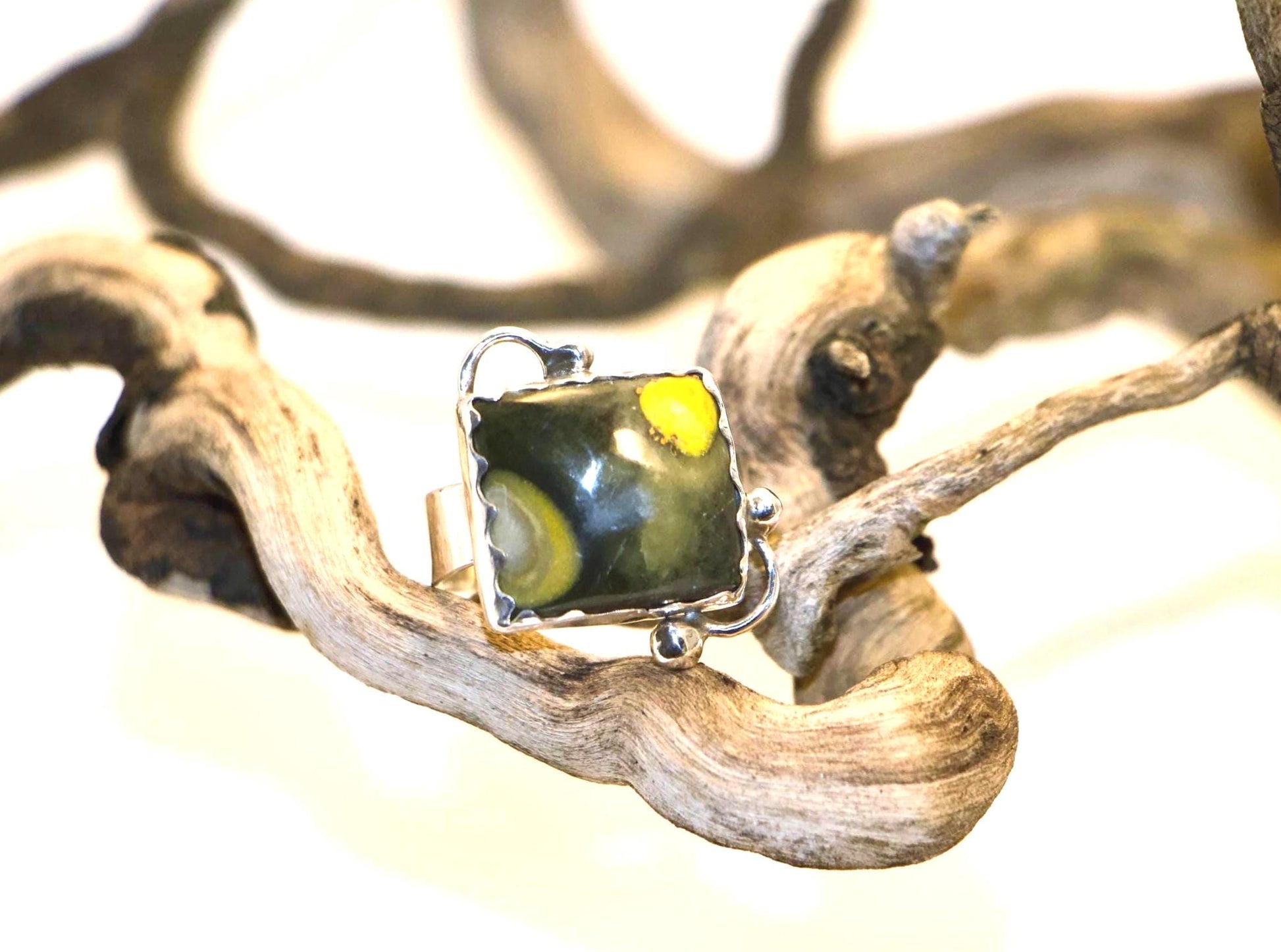 This one-of-a-kind ring features a piece of yellow Jasper—famous for its bold yellows and swirling earthy tones. This stone shows a striking pop of golden yellow against dark yellow and charcoal patterns.